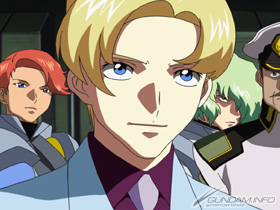 他与身为欧普宰相的父亲乌纳特•艾玛•圣兰一起,在背地里里阴谋操纵地球上少数接受调整者的中立国・欧普联合首长国的代表首长卡佳里•由拉•阿斯哈。从周围对她施加压力,对于想维持中立的她,缔结以大西洋联邦为主体的地球联合加盟各国安全保障条约,还与卡佳里立下婚约,当盛大的结婚仪式正在举行的时候,突然出现身分不明的自由高达(事实上是由主角煌・大和驾驶)从结婚会场把卡佳里绑架走了。