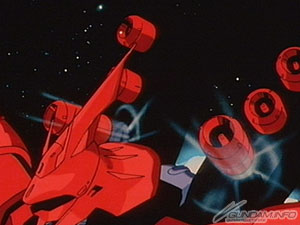 这边的感应炮本体和ν高达的鳍状感应炮不同,还没使用的时候会变成圆筒形。感应炮自本体射出后,分离的盖子会向四方展开,光束炮也伸长进入攻击态势。而且与过去的感应炮相比光束威力和运作时间效能也都大幅度提升! 和在‘机动战士高达’当中被打到体无完肤的时候相比可是大不相同啊! 面对阿姆罗驾驶的高达也完全不觉得会输啊(←唉呀、旗标又立起来了)。