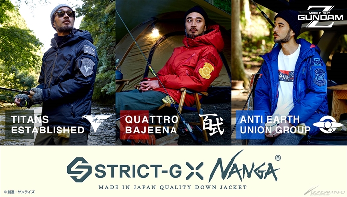 本作为第5弹,STRICT-G和NANGA的合作商品有纪念‘机动战士Z高达’35周年的羽绒外套“奥布款式”“迪坦斯款式”“克瓦特罗・巴吉纳款式”,以及“标志图样T恤”“迷你睡袋 百式”。