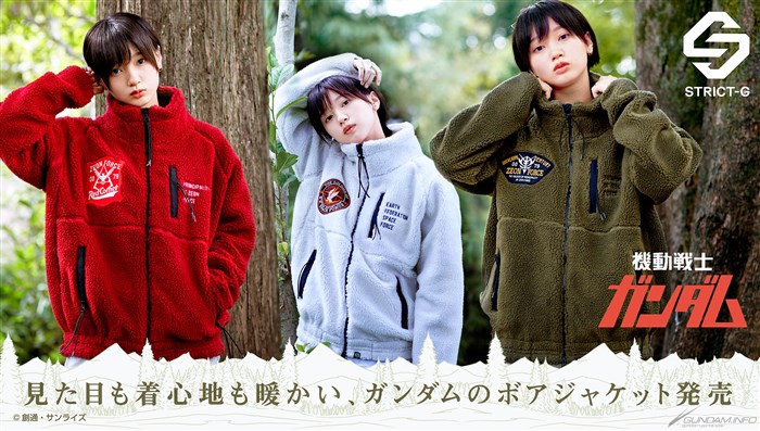 本商品以‘机动战士高达’为题材,采用了有暖和感的绒毛质感BOA材质的抓毛绒外套。阵容有“E.F.S.F.款式”“ZEON款式”“RED COMET款式”共3种。