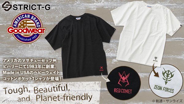 采纳高达世界观的成衣商店“STRICT-G”,将于明日8月3日(二)起,发售和在美国麻萨诸塞州贝弗利创业的“Goodwear”联名的“‘机动战士高达’重量级口袋T恤”。