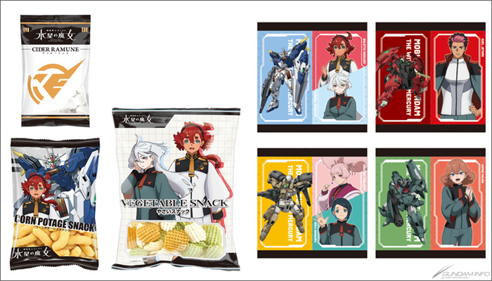 内容为“汽水糖”“玉米浓汤零嘴”“蔬菜零嘴”的混合包,各包装皆出自‘机动战士高达 水星的魔女’,有卫冕者标志、斯莱塔、米奥莉奈及风灵高达(修改型)的设计。