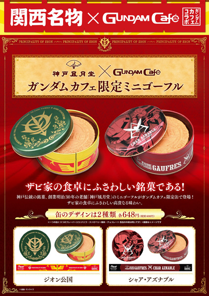 迷你法兰酥将推出GUNDAM Café限定设计的“吉翁公国”和“夏亚・阿兹纳布尔”2种,内含香草・草莓口味・巧克力3种口味。
