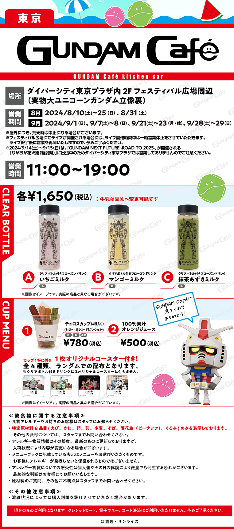 8月10日起“GUNDAM Cafe”餐车决定在实物大独角兽高达立像的背后展店!也准备了夏季应景的清凉餐点!