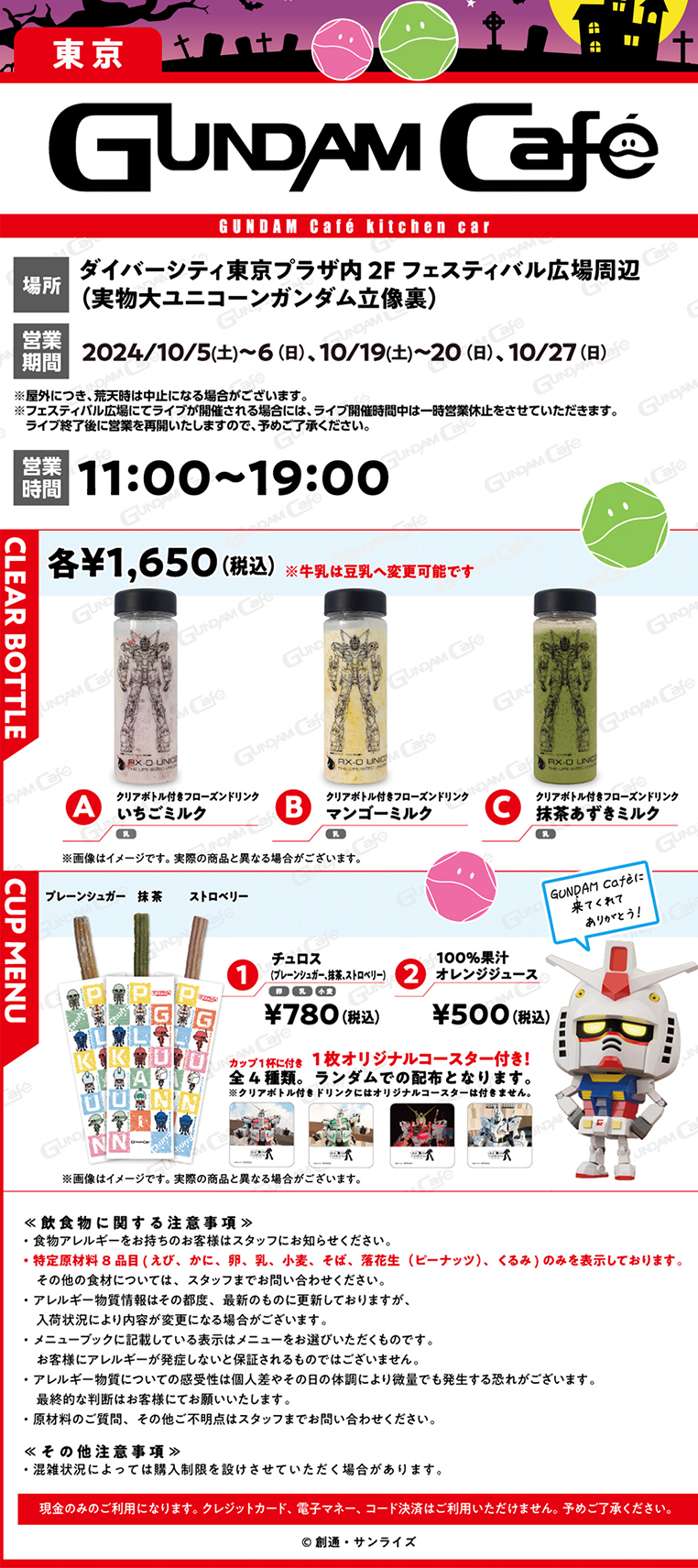 此外,“GUNDAM Cafe”餐车决定于10月5日(六)、6日(日)、19日(六)、20日(日)、27日(日)于东京・实物大独角兽高达立象后方展店。餐车将贩售附“实物大独角兽高达立象”款式水瓶的冰沙以及附独家杯垫的即拿棒、100%果汁柳橙汁等。