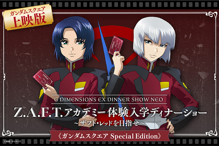 首次在GUNDAM SQUARE举办的晚餐秀“Z.A.F.T.学园体验入学晚餐秀~目标札夫特红衣~GUNDAM SQUARE Special Edition”,将会对GUNDAM Cafe TOKYO的“G DIMENSIONS EX DINNER SHOW NEO”作出部分内容变更来举行。