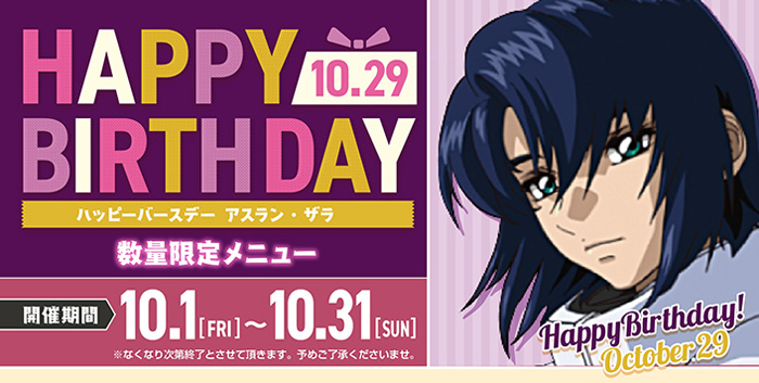 高达官方咖啡厅“GUNDAM Café”各门市和大阪“GUNDAM SQUARE”将于10月1日(五)起,开始举办“生日快乐阿斯兰・萨拉”。
