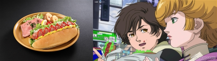 ‘机动战士高达UC’episode1“独角兽之日”中奥黛莉・伯恩(米涅瓦・萨比)都赞不绝口的热狗,搭配上episode5“黑色独角兽”中登场的烤牛肉、切半马铃薯的“回忆的热狗”。