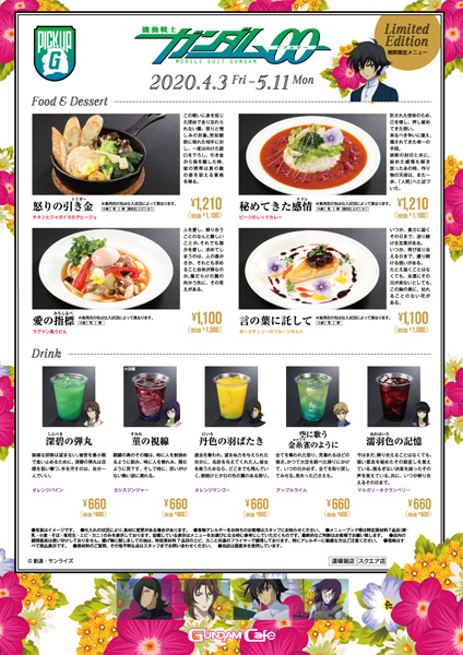 在高达官方咖啡厅“GUNDAM Café ”台场门市和大阪道顿堀门市、大阪“GUNDAM SQUARE”,将于4月3日(五)起,开始提供PICK-UP-G系列“‘机动战士高达00’期间限定菜单”。