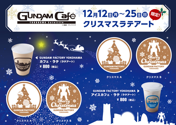 “耶诞拉花”准备了“哈啰耶诞树图案(耶诞A)”和“”可动高达”和雪花图案(耶诞B)”2种图案,施加在咖啡拿铁或冰咖啡拿铁上。期间限定至12月25日(日)为止,售价各为800日圆(含税)。