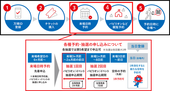 大阪·关西万博会将引入参观日期和时间及展馆和活动等的预约制度。预约参观日期和时间后,即可申请事前预约的展馆与活动。