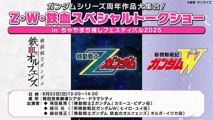 作为将于 6 月 21 日(周六)和 22 日(周日)在大阪梅田和茶屋町地区举行的“茶屋町推祭 2025”活动的舞台活动,决定举办“高达系列周年纪念作品大众聚会!Ζ W Iron Blood 特别脱口秀茶屋町推祭 2025”。