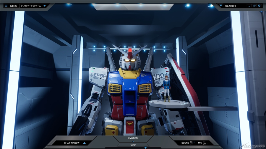 发表会结束后,会移动至“接待室”。将显示出自己的虚拟外观,可以在VR空间内自由漫步,和参加者同伴沟通。接待室内会有刚刚结束讲解的阿姆罗3D虚拟外观和“PGU RX-78-2 高达”并排登场。可以从360度中调整喜欢的角度来观赏阿姆罗和高达,也可以靠近确认细节,所以是粉丝必看的区域。