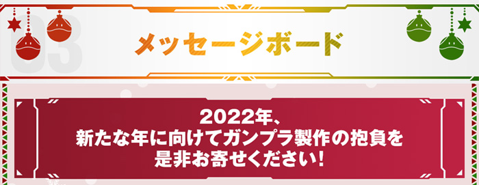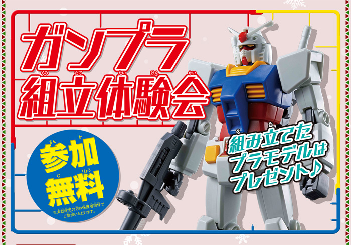 本活动将实施“高达模型组装体验会”和“GUNPLA WINTER COMPETITION”、“留言板”。活动期间中,还有准备送给参加者的小礼物,务必来参考看看喔。