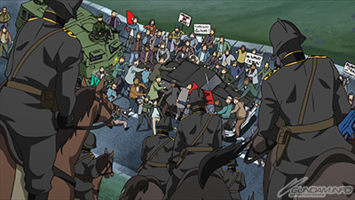 接着是安彦总监督也赞不绝口,卡斯巴尔和阿尔黛西亚乘坐钢坦克离去的镜头。描绘出这里亲子离别情绪的是在‘机动战士高达UC’也相当活跃的茂木信二郎。