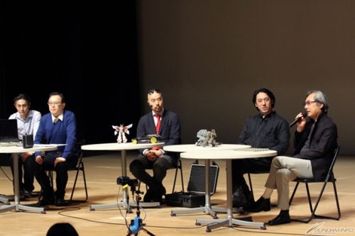 在座谈会之后,当天主要的创作者高峰会就开始了。接着大河原老师就登场了,现代美术家仓田光吾郎、机器人建造师石田贤司等来宾也登台了。先前的高峰会都是邀请和大河原老师同样为机械设计师的来宾展开座谈会,但这次改变了倾向,以「1/1实吋大机器人最前线」为主题。此外这次的出演者也有着共通点,大家亲手进制作,将科幻的机械在现实中立体化。仓田先生以铁为素材制作了大河原老师代表作之一「装甲骑兵」中登场的实吋大眼镜狗。