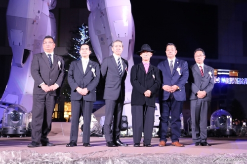 左起为Diver City Tokyo Plaza 管理中心所长 上野山勉丶TOKYO 高达计画2016执行委员会会长・东京港埠头股份有限公司常务董事 前田敏宣丶BANDAI NAMCO Holdings Inc.社长 田口三昭丶『机动战士高达』总监督 富野由悠季丶SUNRISE股份有限公司社长 宫河恭夫丶创通股份有限公司 副社长 出原隆史。