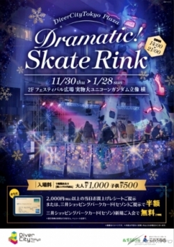 户外型溜冰场「Dramatic溜冰场」位於Diver City Tokyo Plaza 2F节庆广场的「实体大独角兽高达立像」旁,时间至2018年1月28日(日)。场地采用树脂板,能享受到溜冰的乐趣又不怕沾湿衣服,更利用了点灯装饰表现出属於冬季的浪漫空间。