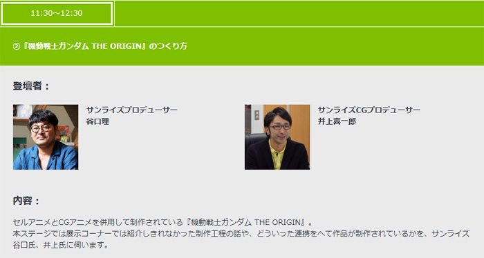 讲座将由‘THE ORIGIN’的谷口 理制作人和井上喜一郎CG制作人登台,以并用传统动画和CG动画的本作为主题,来介绍制作过程及经过什么样的配合来制作出作品等秘辛。