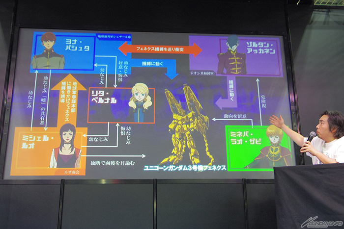 接着还介绍了拥有可爱的少女容姿,同时也身为紧握本作重要关键的MS「独角兽高达3号机 凤凰」的驾驶员莉塔・贝尔纳尔,以及虽然夏亚在世的计划已被粉碎,却可说是最令人期待在本片登场的佐尔坦・亚卡宁。