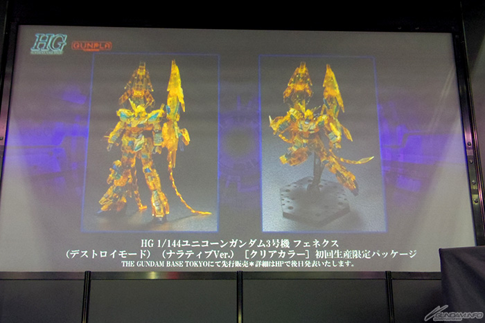 包装盒采用主视觉图,「HG 1/144 独角兽高达3号机 凤凰(毁灭模式)(NARRATIVE Ver.)〔透明彩色〕初回制造限定包装」,确定于各家上映电影院及高达东京基地发售。同时,高达东京基地也宣布确定举办「机动战士高达NT世界」的活动。