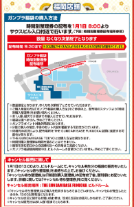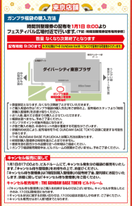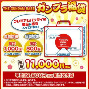 “豪华高达模型福袋”(含税11,000日圆)内容物包含PREMIUM BANDAI商品等等平均价值19,800日圆(含税),限量登场。关于购买方式,将会在元旦8:00起于“节庆广场”附近发放各时段号码牌。