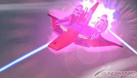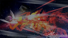 ▲炮门的数量比凤凰高达倍数成长。各辅助翼都有2门、计8门光束炮齐射的“荷电粒子光束加农炮交叉射击”。