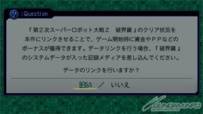 BANDAI NAMCO GAMES推出,4月5日(四)发售预定的PSPR专用游戏“第2次超级机器人大战Z 再世篇”中搭载于游戏开始前连结前作“破界篇”的系统资料,就能入手特典的“连结奖励”系统。