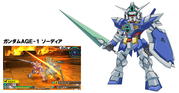 ■高达AGE-1 雷射型 速战型的进化型、以超高速机动型武装所开发出来的机体。 两臂装备的“雷射剑”有常非常强大的切断能力,藉由从腕部分离・合体,也可以当作强力的投掷武器来使用。 |