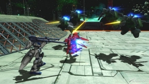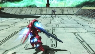 ▲特殊格斗则是可以快速接近敌方的“急速接近”。根据摇杆输入方向不同轨道也会产生变化,摇杆往前会直接冲向敌方(图片左),摇杆往左右会朝斜方移动(图片中),摇杆往后会边上升边移动(图片右)。还有,在特殊格斗中按射击钮会一边后退一边发射光束机枪