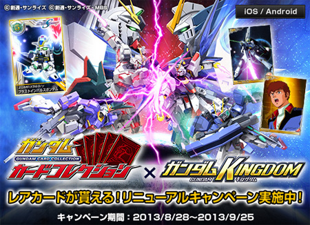 为了纪念更新,和同样在Mobage上好评发布中的“GUNDAM CARD COLLECTION”连动活动也从今天起开始。期间中登入“高达王国(GUNDAM KINGDOM)”,就可以获得能在游戏中使用的稀有卡片。