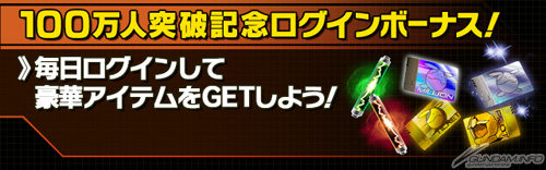 活动内容之一的“突破100万人次!纪念登入奖励!”是在10月1日(二)起到8日(二)止的期间中,每天登入游戏1次就可以获得自用行动EN回复包、自用指挥力回复包、黄金转蛋票、黄金驾驶员转蛋票、豪华转蛋票、百万转蛋票等道具中的其中1种。