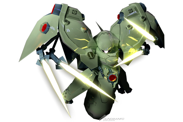在‘机动战士 高达0083’中登场的MA。武装变更前的武器3“飞弹发射器”有追踪性能,能够在射击战给予对方相当的压力。而武装变更后,使用武器3“线控钩爪臂”把敌人拉过来,接着使用武器1“光束军刀(主手臂)”进行追击的战法非常强力。
