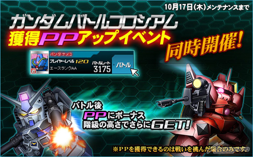 同样从今天10月10日(四)起到10月17日(四)止的限定期间内,开始“ 高达战斗竞技场”、以及“获得PP增量活动”。