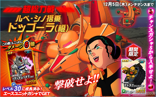 NAMCO BANDAI ONLINE在“Yahoo!游戏”上提供中的免基本费网页游戏“SD GUNDAM OPERATIONS”,从今天11月28日(四)起开始,“鲁佩.席诺驾驶的德葛拉(橙)”在超总力战中登场。并在王牌机体转蛋中新追加超强力机体 “★4 丘贝雷Mk-II(普露兹专用机)”。
