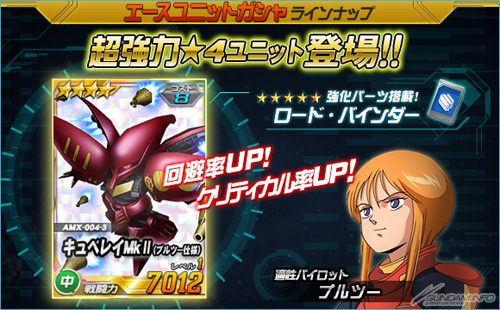 王牌机体转蛋同样从今天起追加“★4 丘贝雷Mk-II(普露兹专用机)”。“★4丘贝雷Mk-II(普露兹专用机)”是搭载强化零件“悬臂夹舱”的超强力机体,请一定要拿到手。
