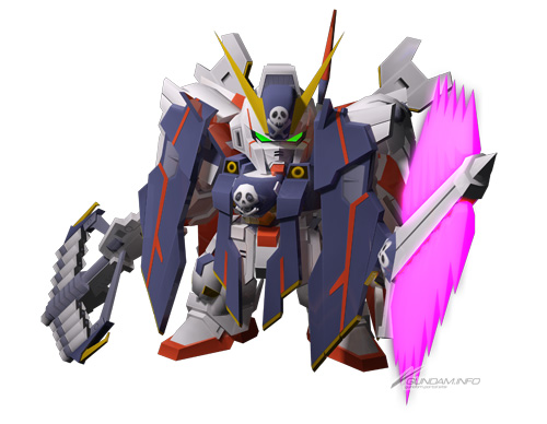 在 ‘机动战士海盗 高达 钢铁的7人’中登场的MS。武器2的“孔雀迫击弩”是一把能将数发光束以扇形同时击发的射击武器,在极近距离使用时能造成多段判定,给予对手重大伤害。另 外,本机只要输入R键即可卸除装备,卸除装备后不但推进量会大幅增加,还拥有耐光束护盾。确实地掌握卸除装备的时机将会是发挥机体实力的关键。