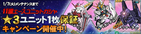 此外在王牌机体转蛋中,除了追加强力机体“★3 ν 高达”以外,过去在总力战中出现的限期机会转蛋也再次登场。而十分超值的“11连转蛋 保证★3机体1台活动”也一并开始了。