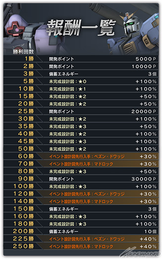 在报酬中有机会抢先获得“泥岩( 高达6号机)”和“培森・德瓦金”等等活动机体的设计图,快累积胜利来获得这些丰富的报酬吧。