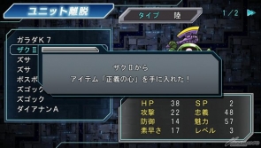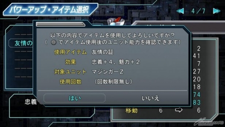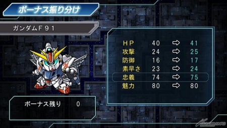 机体的基本数值中,“HP”、“SP”、“攻击”、“防御”、“速度”这5项数值可以藉着提升等级上升,另外再加上“忠义”、“魅力”、“移动”这3项,总共有8项数值,可以在中场休息选单中使用道具来强化。也有能够使“经验值”增加的道具。