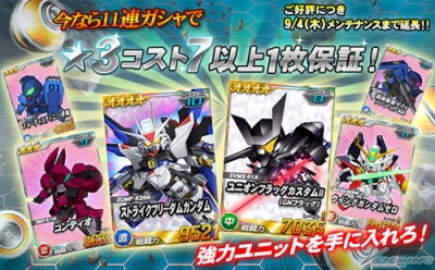 活动期间中,只要使用11连王牌机体转蛋的时候,一定会获得一台★3 COST 7以上的机体。快趁这个机会来拿强力的机体吧。