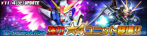 而 在王牌机体转蛋中,则新增了““★4 命运高达”、“★4 漆黑攻击高达”、“★3瞬发型渣古幽灵(雷专用机)”、“★3 基恩改(伊莱杰专用机)”、“★3 达基・伊尔斯(白)”、“★3 量产型钢加农(白色猎犬样式)”等机体。在这些机体中,“★4 命运高达”装备了强化零件“Hyper Duetrion引擎”,“★4 漆黑攻击高达”则装备了“攻击背包系统(N)”,都是非常强力的机体,一定要把这两台机体拿到手喔!