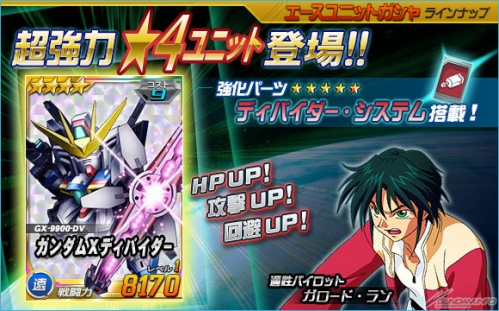 今天起在王牌机体转蛋中,新增了“★4 高达X Divider”、“★3空中霸王高达”等机体。“★4高达X Divider”是装备了强化零件“Divider系统”的强力机体,一定要拿到手!