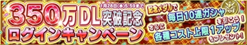 依照在活动期间内登入游戏的天数,可获得每天能够转1次的10连转蛋“DL次数突破350万纪念代币”和“各种COST上限加1”等好礼。