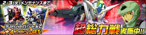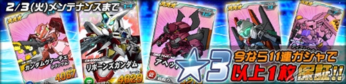 自今天1月27日(二)起,将同时举办“强力卡片GET!★3以上机体保证活动”、“任务、击破敌人时获得GP增量活动”、“小队压制战‐宇宙战”等活动。