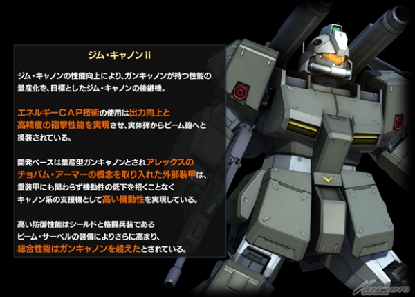 “吉 姆加农II”是目标量产拥有钢加农性能的吉姆加农后继机。使用能源CAP技术,得以实现出力的提高和高精度的炮击性能,从实体弹换装成光束炮。开发基础是 量产型钢加农,藉由取自亚雷克斯复合装甲概念的外部装甲,实现了加农系作为支援机的高机动性。综合性能被认为超越了钢加农。