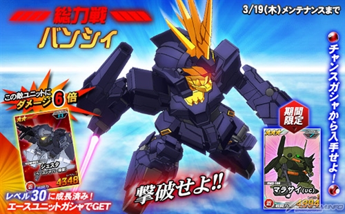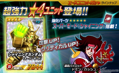 从今天起,王牌驾驶员转蛋追加了,搭载了强化零件“超级模式(闪光高达)”的“★4 闪光高达(超级模式)”之外,“★3 飞翼高达零式”、“★3 沙萨比”、“★3 V2高达”等机体也再次登场了。