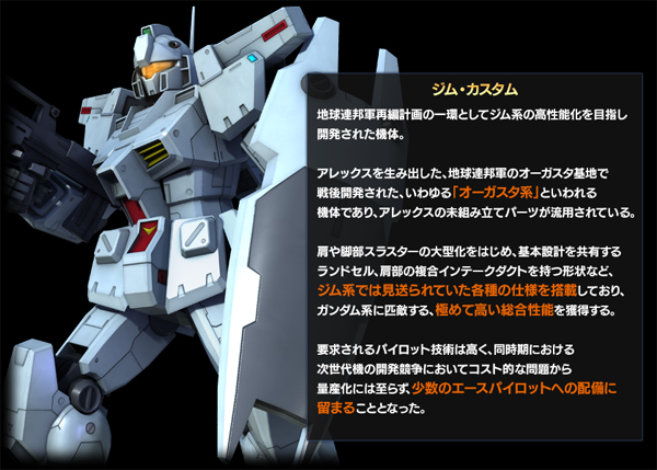“吉姆特装型”是作为在地球联邦军再编计划中的一环,目标是将吉姆系机体高性能化而开发的机体。肩膀和腿部推进器大型化,搭载各式各样吉姆系原本没有搭载的各种样式,获得能够与高达系匹敌的高度综合性能。