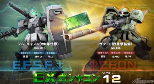 可以在活动举办期间的战斗报酬中获得“EX转蛋票”,能够用于限期举办的转蛋第12弹“EX转蛋Vol.12”,其中地球联邦军的新参战机体是“吉姆加农(WD队样式)”、吉翁公国军的新参战机体是“渣古IIS型(重击装备)”。