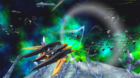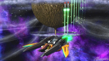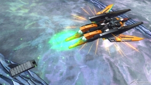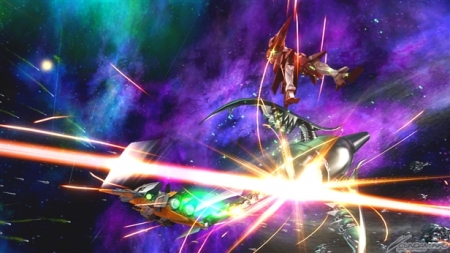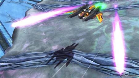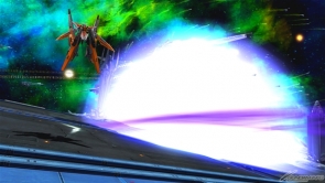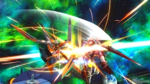 ▲特殊射击武装会呼叫“量子型00”,摇杆方向对应不同的攻击方式。摇杆左右是用“GN剑V・步枪模式”放出照射光束斩击前方、摇杆上下或是不动,量子型00会量子化靠近敌机,使用“GN剑V”发动格斗攻击。